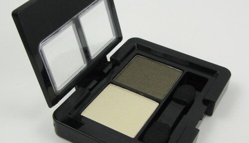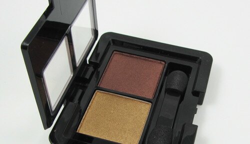 This eyeshadow duo contains a pale yellow and a deep army green. The yellow is a touch dry and a bit sheer, but has a lovely iridescence The green is soft, silky, and beautifully rich and pigmented. The texture is just fabulous – it’s like the best of the Wet n Wild Color Icon formula.