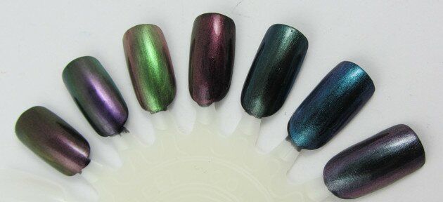 A long, long time ago I promised to post swatches of franken nail polishes made with TKB Trading’s Planetary Sampler – seven different color shifting pigments which can be used in nail polish. The pigments are also sold separately as Travel to Mercury, Travel to Venus, etc.