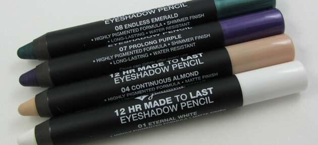 Jordana is one of my favorite drugstore brands – very inexpensive and generally good quality – so I was excited to see that they’ve released some new products. I bought several to test out and review, and first up I have four of the new 12-Hour Made To Last Eyeshadow Pencils.