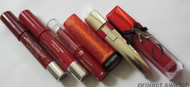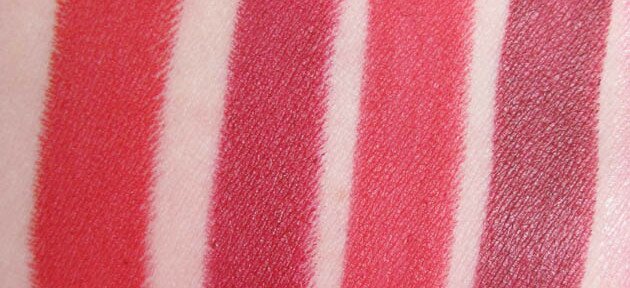 The full names of the products are (left to right): Revlon Adore Kissable Balm Stain, Revlon Romantic Kissable Balm Stain, Jordana Sweet Strawberry Easyshine Glossy Lip Color, Revlon Candy Apple Lip Butter, L’oreal Endless Red Caresse Wet Shine Stain, Physician’s Formula Red Sexy Booster Glossy Stain.